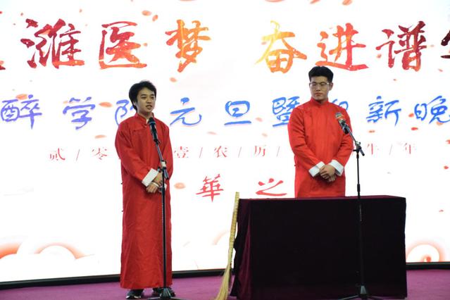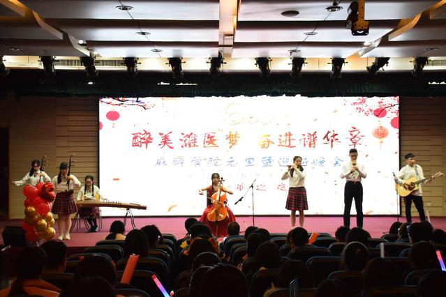 本次晚会分为“欢歌曼舞 喜迎新春”、“醉美风华 逐梦扬帆”、“和衷共济 医路同行”三个篇章,节目形式多样,内容丰富,题材新颖,歌曲、舞蹈、小品、相声、器乐合奏等一应俱全。在教师、学生以及新生家长的祝福视频中晚会拉开帷幕,师生同跳一支舞,舞出新年新气象,掀起全场小高潮;器乐合奏《一路稻香》,古筝、二胡、竹笛、大提琴、吉他等中西乐器各美其美、交融碰撞,演绎出一段古典与动感结合的旋律;小品《疫不容辞》,笑声与感动中诠释出疫情防控期间医护人员舍小家、顾大家的家国情怀和冲锋在前、不畏生死的责任担当;朗诵《医者仁心》,激情澎湃、抑扬顿挫,表达了麻醉学子对白衣天使的崇敬之情和对专业道路的坚定;优美的民舞表演《初见》带观众走入历史,领略了一段千年风雅;妙趣横生的相声《醉谈体育》让大家开怀一笑的同时明白体能锻炼的意义;《明天你要跳舞吗》、现代舞《dancing my soul》、歌曲串烧《同气连枝,共盼春来》洋溢着青春的气息,传递出麻醉学子积极向上、勇往直前的精神风貌和对未来的美好祝愿……每个节目都精彩万分,台下掌声此起彼伏,给观众留下了深刻印象。晚会在院歌合唱《妙手仁心 守望生命》中落下帷幕。晚会之前,麻醉学院进行了2020届学生会换届工作。
