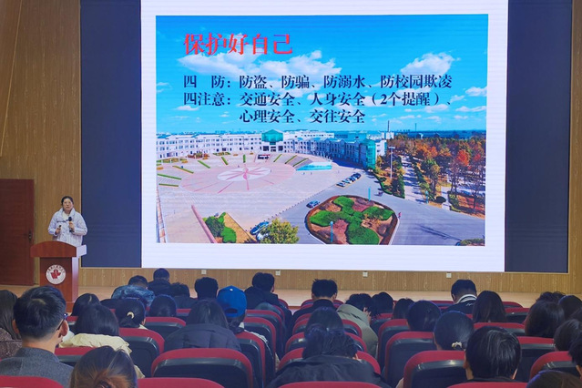 课堂上,董惠平围绕消防安全、网络安全、交通安全、校外安全、心理健康等多个维度,全面普及安全知识并着重强调核心安全注意事项。她提醒同学们严守“四防”“四注意”要求,守护好自身安全。在强调安全问题的同时,她还引导同学们学会积极的自我调适,知感恩,少抱怨,做好小规划,实现大目标。夏德涛重点强调网络安全的重要性,结合近期教育系统通报的安全事故案例,警示同学们提高警惕、严防网络诈骗。辅导员针对电动车规范使用作出明确要求,通过细致入微的指导,引导学生增强安全责任意识,筑牢校园安全防线。同学们还观看了反诈及校园消防安全等警示片。